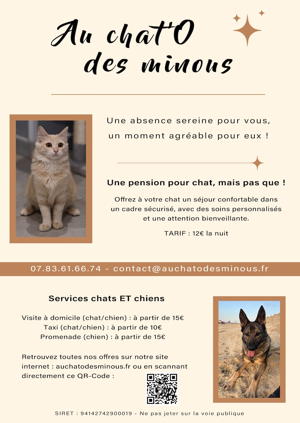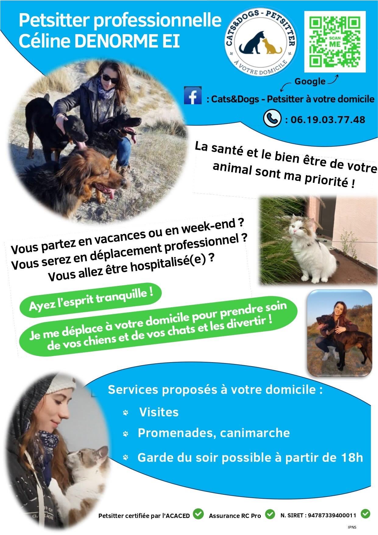 Professionnelle expérimentée diplômée de l’ACACED, je prends soin, à votre domicile, de vos chiens, chats,(…) et s’adapte à vos demandes.